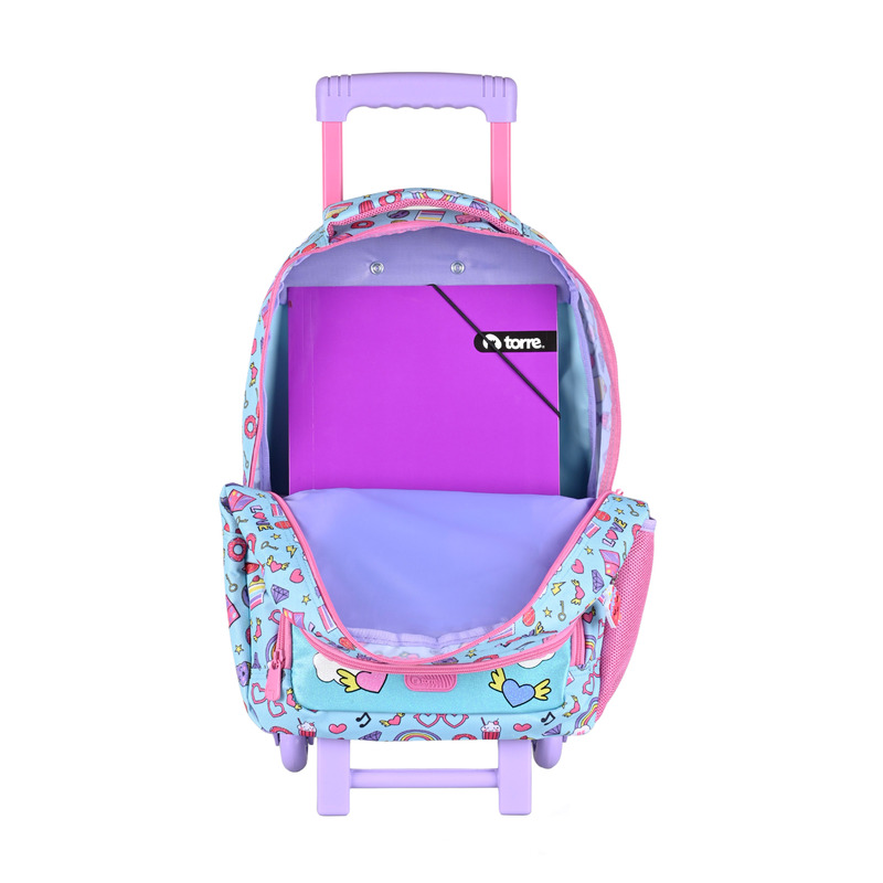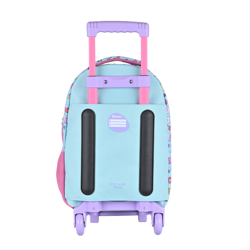 - La mochila trolley de 36 L cuenta con doble rueda, manilla telescópica de tres posiciones y refuerzo posterior anti-golpe para un transporte cómodo y seguro. Su base doble reforzada y costuras resistentes aseguran gran durabilidad frente al uso diario. Incluye bolsillo porta botella, divisiones internas y cierres encarrilables que facilitan la organización del material escolar.